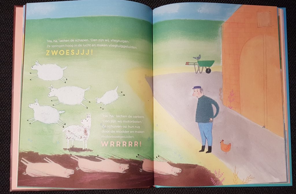 Het lammetje dat een varken is, begint met een prent zoals je het zou verwachten. De schapen grazen in de wei en de varkens rollen door de modder. Maar toch klopt er iets niet. Een van de lammetjes springt in de modder.