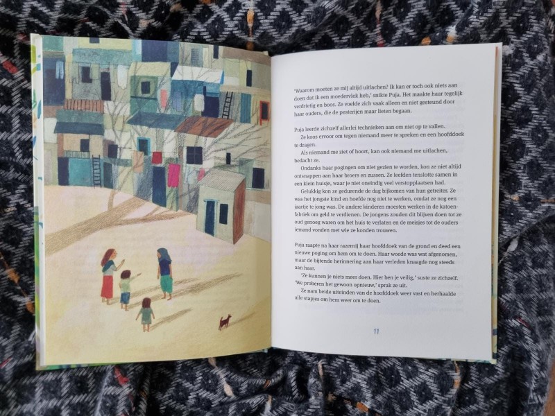 Na het verhaal meerdere keren gelezen te hebben kwam ik erachter wat voor mij niet congruent voelt. Puja is dertien jaar, maar de illustraties passen voor mij niet altijd bij deze leeftijd. Eerst vond ik dat jammer, maar na een gesprek met mijn man hierover kon ik het beter duiden. Puja is met haar dertien jaar in een bijzondere leeftijdsfase, zeker in de cultuur waarin zij opgroeit. Gakpo tilt Puja op aan het eind van het boek. Dit plaatje oogt kinderlijk. Dit contrasteert met uithuwelijking. Soms al zo volwassen, soms echt nog een kind. Janneke Ipenburg heeft dit eigenlijk heel mooi gevangen in de illustraties, maar het behoeft aandacht en rust om dit er goed uit te halen.