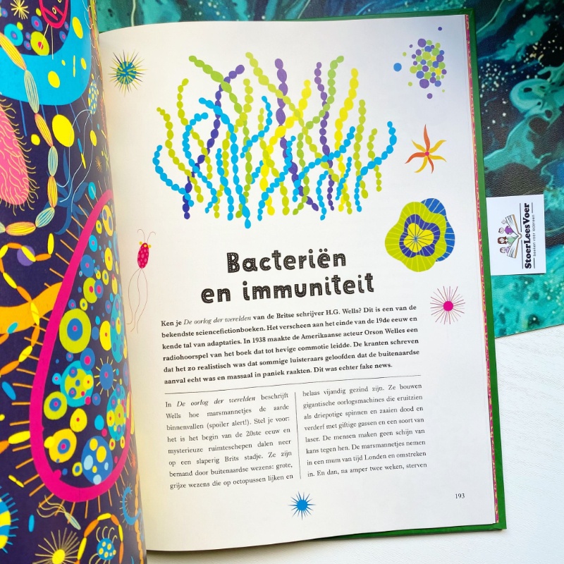 Daarnaast ben ik zelf chronisch ziek en zit ik momenteel in een medicijnbehandeling die mijn immuniteit naar beneden haalt. Hierbij betrek ik mijn dochters; ik geef ze informatie. Maar zo speels aan de hand van een boek is echt ideaal voor erbij. Het laatste hoofdstuk is dan ook erg fijn om samen te bespreken. En ik vind het weer tof dat ‘De oorlog der werelden’ van H.G. Wells een connectie heeft met dit hoofdstuk.