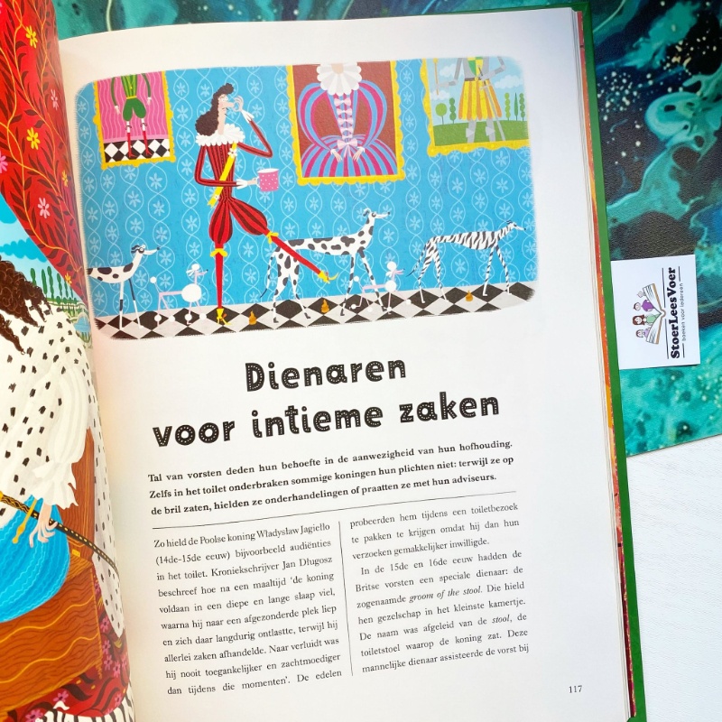Al snel moeten we onze reis bijstellen, want Het mooiste boek van grote viezigheid is een kleurrijke explosie! De inhoud is tof, maar de illustraties zeker ook. Beide zijn even aanwezig. Soms is er een fullcolorprent die twee bladzijdes bestrijkt en dan zijn de illustraties weer aanvullend bij de tekst. Er zijn ook pagina’s waarbij er diverse (bekende) personen afgebeeld staan; dat leest een beetje als een strip. Dus naast de toffe titels navigeren wij nu ook aan de hand van de illustraties. We kijken allemaal onze ogen uit.