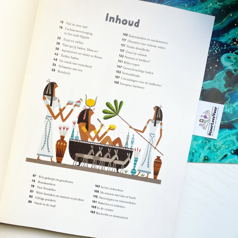 De inhoud is heel uitgebreid van ‘Het mooiste boek van grote viezigheid’, en fijn dat het er is. Ik hou altijd wel van een overzicht om mee te starten in een weetjesboek. Ik moet alles voorlezen aan mijn dochters en elke titel roept wel vragen op of giebels. Stank in de stad, Billen vegen en dienaren voor intieme zaken zijn wel hoofdstukken die er voor hen uitspringen. Ook zweet je schoon vindt mijn oudste dochter van 8 interessant klinken. Voordat we gaan bladeren, wil ik zelf nog even het voorwoord lezen. Maar daarna zijn we klaar voor de reis door dit boek!