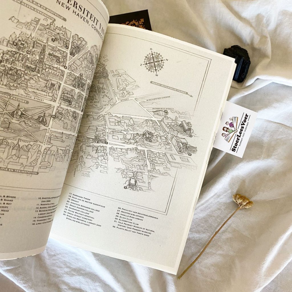 Vervolgens komt er een kaart waar je u tegen zegt. Nee geen hele wereld, gewoon alleen Yale maar wel met 32 punten die uit het boek komen. Ik vind het wat veel en sla het over, terwijl ik normaal wel van kaarten kan genieten. De proloog laat ons kennismaken met Alex en dan komen we in het verhaal. Ik ervaar dit deels als spannend en deels als overwelming. Bardugo weet me even helemaal murw te krijgen met haar verhaal. Tot op een punt dat ik twijfel of ik wel door Het negende huis ga komen. Het is deels een spannend verhaal vol mysterie, deels de verrijking die Bardugo geeft in alles. Van de uitgebreide uitleg van architectuur, tot kunst en cultuur. Maar daarnaast is ze ook bezig haar wereld te bouwen van geheime genootschappen, geesten en magie. En dan zijn er nog haar karakters.