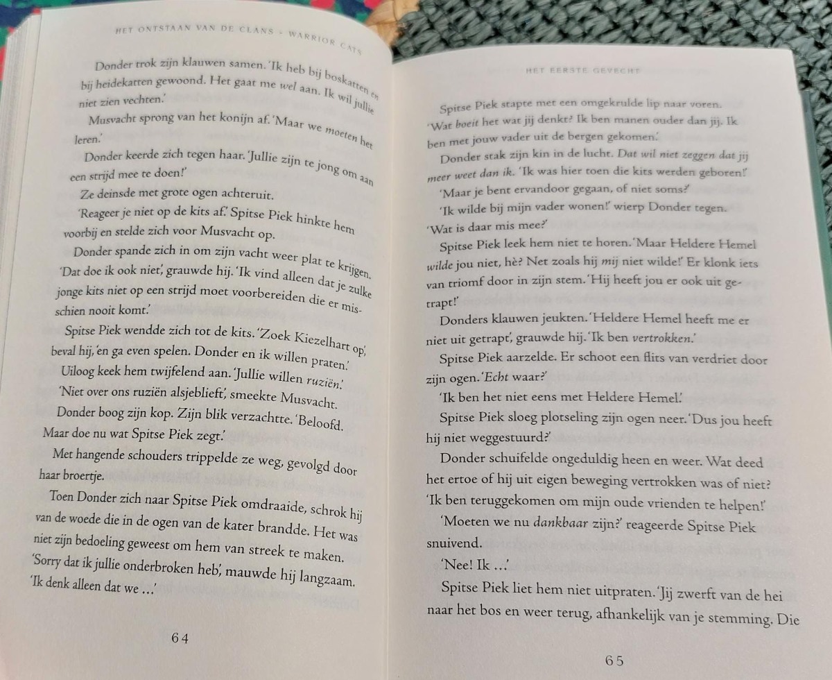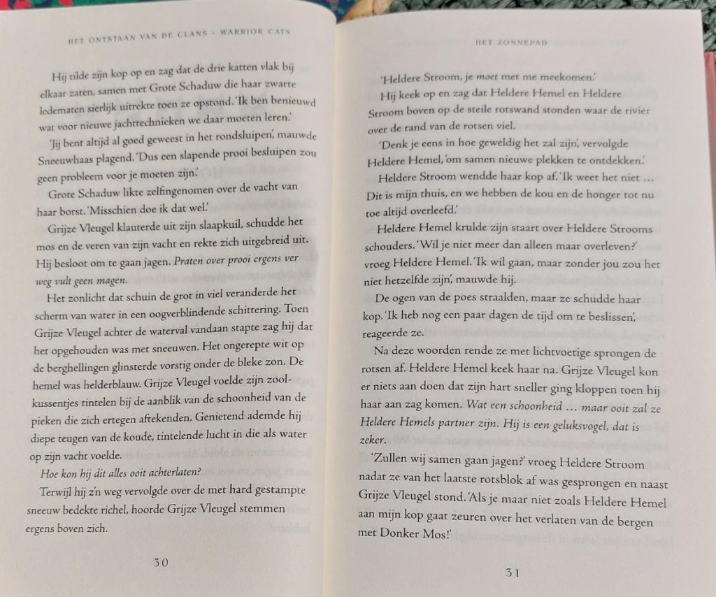 Bij mij op school lezen kinderen vanaf groep 6 mee in de prachtig omschreven avonturen. Van zeer gedetailleerde omschrijvingen van gevechten met vossen, tot het jagen op konijnen. Ik ben altijd in twijfel of ik nu blij ben of niet dat er geen illustraties in de boeken zitten. Je kunt je eigen verbeelding prima gebruiken om je voor te stellen hoe de katten leven. Maar soms zou ik wel eens een getekend hol willen zien, of de medicijnvoorraad van de katten die verstand hebben van de genezende werking van planten en kruiden.