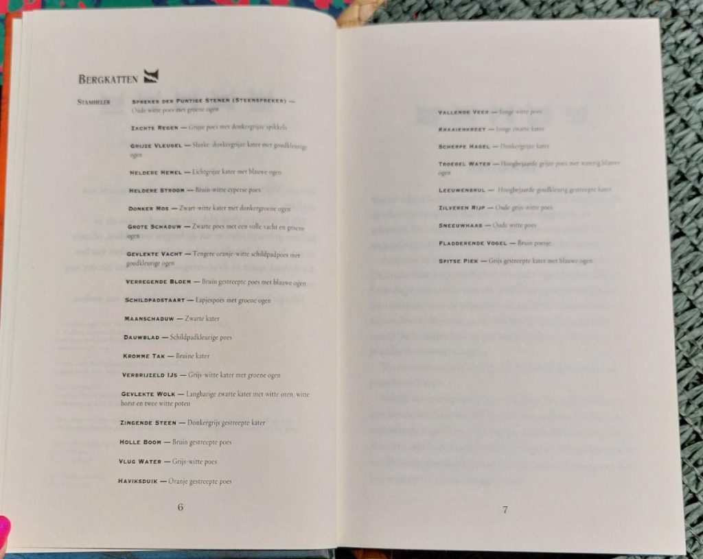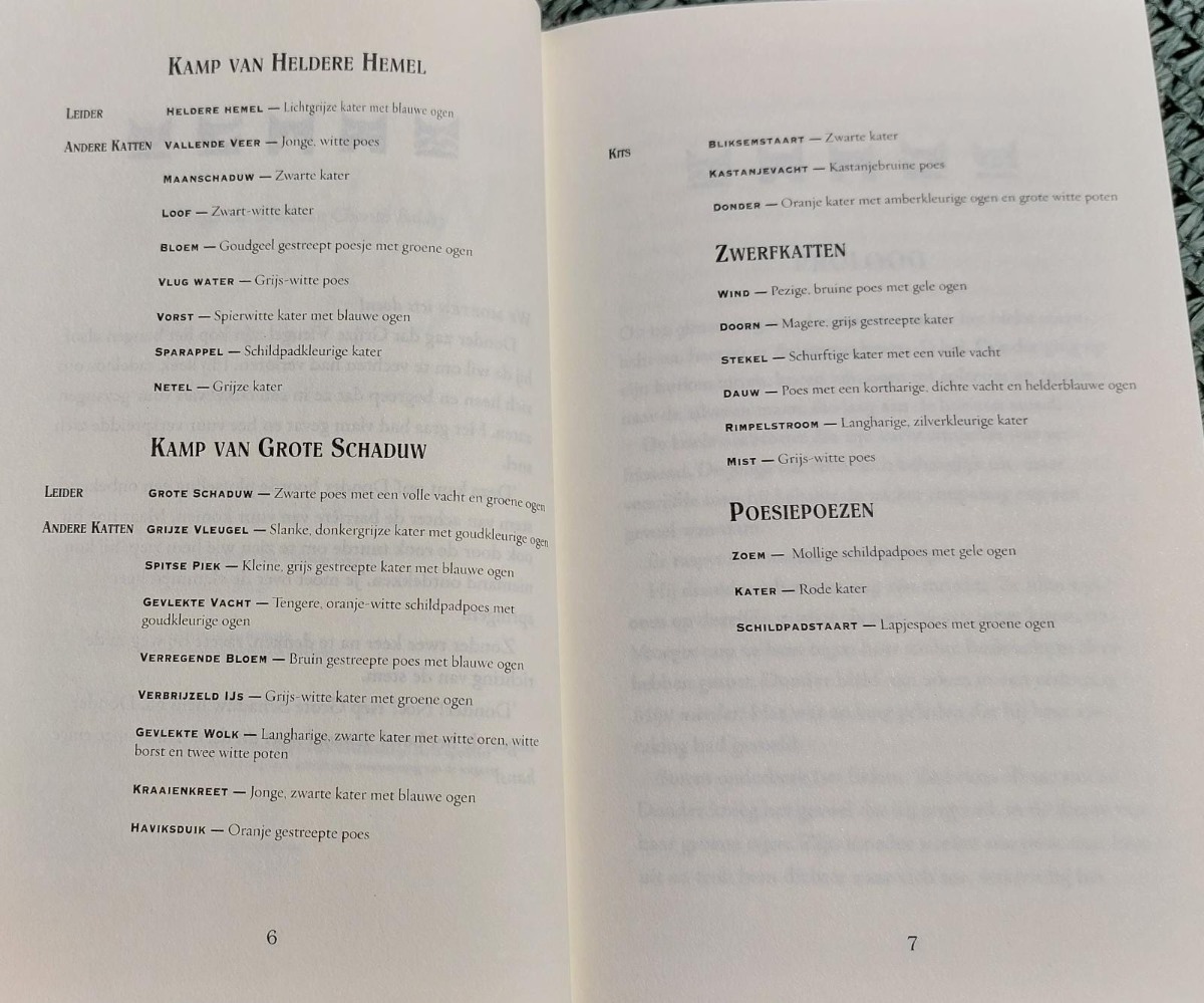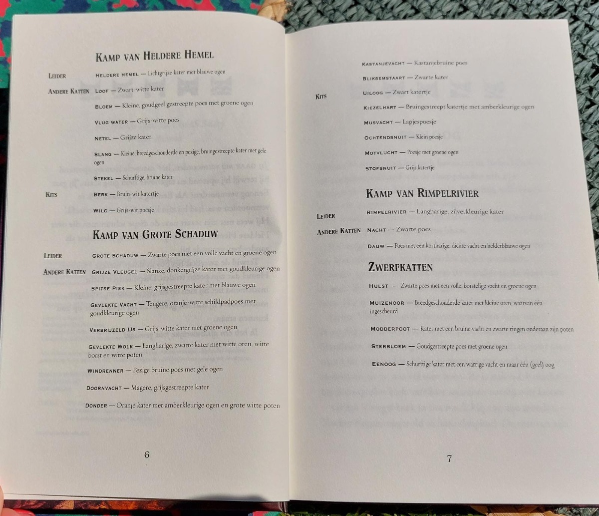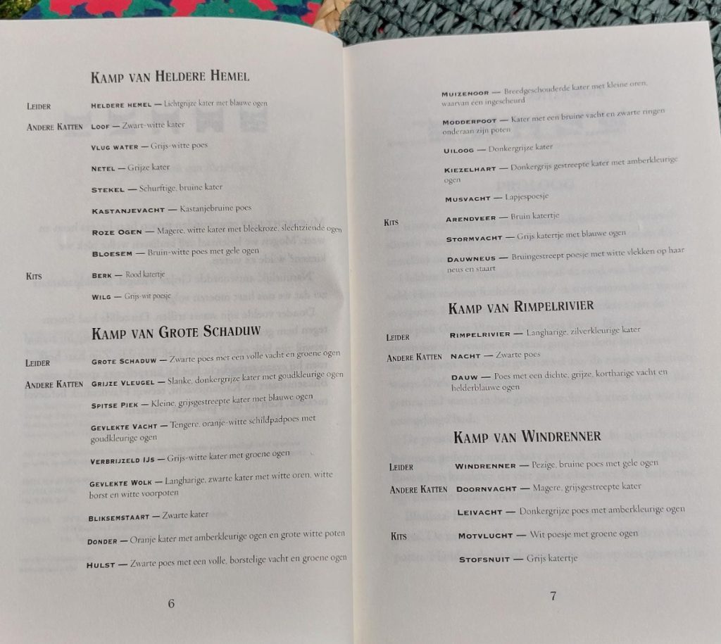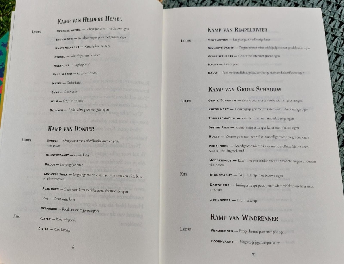 De boeken van de WarriorCats laten elk deel weer aan het begin de leden van de Clans zien. Alleen heten ze nog anders, want pas op het einde van het verhaal wordt alles duidelijk. Echte fans hoef ik niks te vertellen als ik zeg kamp van Heldere hemel, kamp van Donder, kamp van Rimpelrivier, kamp van Grote Schaduw en kamp van Windrenner.