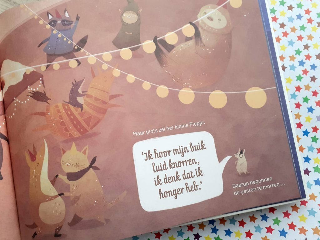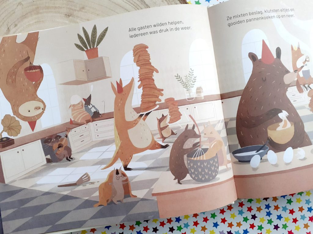 Het pannenkoekenfeest is een gezellig en smakelijk prentenboek van Eva Lindell. Met mooie en zachte illustraties van Cecilia Heikkila. En heel veel dieren vind je in dit boek! In het bos wonen bijvoorbeeld ook een luiaard, beer, vos en das. Een gezellige beestenboel. Een boek over vriendschap, lekker eten en een beetje rommel maken. Wie wordt daar nou niet blij van? En ook dat het heel fijn is als er vrienden zijn die je helpen als iets niet lukt.