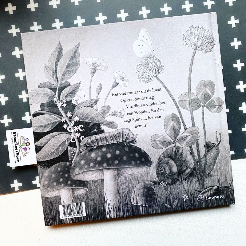 Mysterie in het gras, schitterend getekend door Eric en Terry Fan, bekend van De tuinman in de nacht (Bol). Het viel zomaar uit de lucht. Op een donderdag. Niemand wist wat het was, maar het was het meest bijzondere ding dat de insecten ooit hadden gezien. Spin bouwt er een Grote Tentoonstelling omheen en van heinde en verre komen de dieren het tegen betaling bekijken. Tot op een dag een vijfbenig monster Het Wonder uit de Lucht weer meeneemt… Maar het leven zit vol verrassingen!