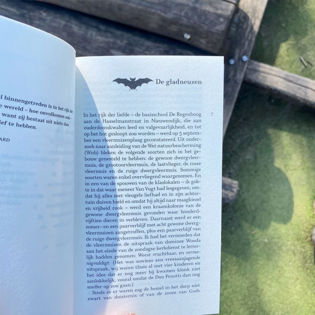 Het warmtefort is een klein en fijn boekje. En vanaf het eerste moment dat ik het in de Ako op het station zag liggen, ben ik al gefascineerd. De vleermuizen sieren de cover als een mooie schoolposter waar ik als kind me menige keren in heb verloren. Vaak ten koste van de les die werd gegeven, maar ik ben en blijf een beelddenker, dromer en heb dit niet altijd in de hand. Zodra ik verder duik in de synopsis, moet ik dan ook glimlachen. Dit boek is een ode aan Rijnevelds basisschooltijd, aan zijn leraressen. Hoe passend dat die cover ook bij mij direct herinneringen aan deze tijd oproept.