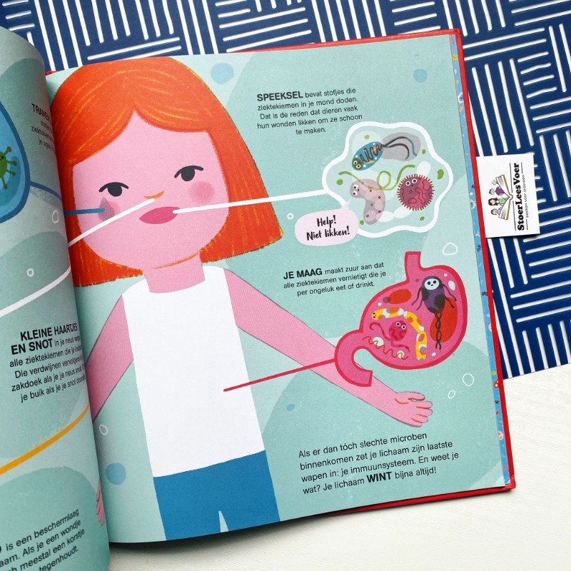 Alhoewel… de illustraties zijn zo toegankelijk en beeldend dat mijn oudste dochter, een actieve beelddenker, even de kriebels kreeg. Haar handen werden opeens een actief slagveld met goede en slechte microben met gezichtjes en tanden, sommigen met cape. Een onverwachte uitwerking die ik niet helemaal had kunnen voorspellen. Gelukkig wordt er verderop in Hier komen de microben, aandacht besteden aan dat je niet bang hoeft te zijn. Dit kalmeert haar en we kunnen deze drempel over en door naar de kennis en haar bewustwording laten groeien op een fijne manier.