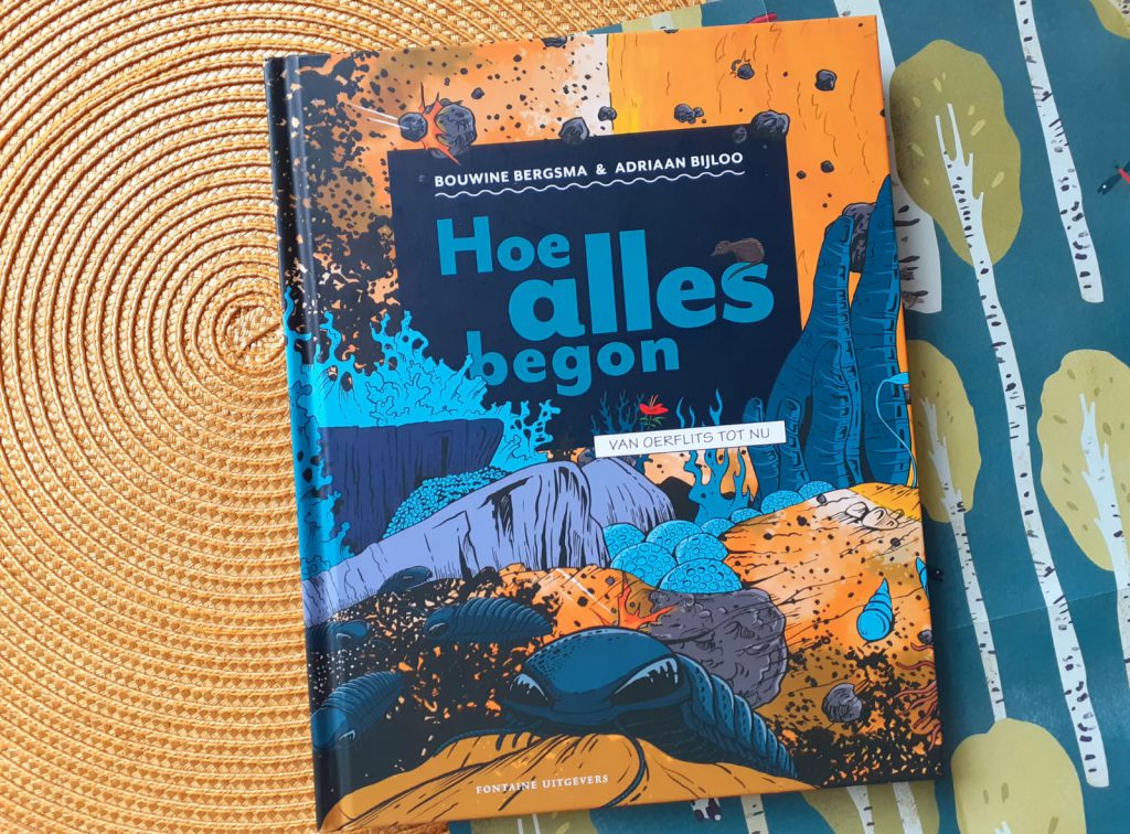 Bouwine Bergsma is de auteur van Hoe alles begon. De illustraties zijn van Adriaan Bijloo. Aan dit boek werkten ook heel veel wetenschappers mee. Zoals dr. Gerard Jagers op Akkerhuis die de zogenaamde operatortheorie heeft ontwikkeld. Ook zijn er bijvoorbeeld een astrofysicus en paleontoloog bij betrokken geweest. Het is natuurlijk een vereenvoudigde weergave. Maar het wordt wel heel mooi verteld en getekend hoe de wereld er in verschillende fases uit moet hebben gezien.