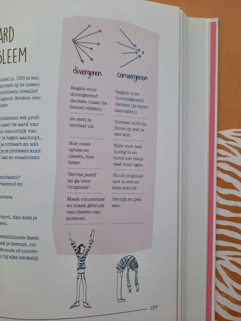 ‘Hoe creatiever hoe liever gaat best diep in op je eigen mindset, gewoontes en voorkeuren als het gaat om veranderingen en problemen oplossen. Maar het biedt ook allerlei tips en manieren waarop je dit anders (en creatiever) kunt aanpakken. Bij het problemen oplossen kun je het systematischer aanpakken, in plaats van problemen zo te benaderen zoals je gewend bent. Een structuur daarin volgen klinkt misschien niet direct creatief, maar ik denk dat je juist door de verschillende stappen te volgen, anders kunt kijken. Er staan verschillende activiteiten en experimenten in het boek, het is leuk om in het boek te kijken waar je van ‘aan gaat’, zodat je dat kunt uitproberen.