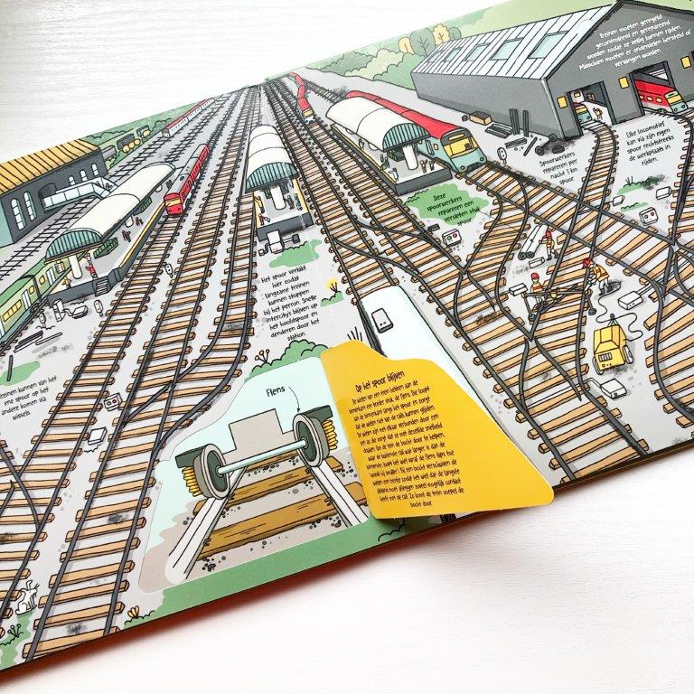 Er zit veel tekst in, leuke duidelijke illustraties en als extra element zitten er overal flapjes verstopt die nog meer diepgang geven en informatie. Sommige pagina’s kan je uitvouwen. Hierdoor is het ‘Hoe werkt een trein’-boek geschikt voor kinderen boven de 3 jaar.