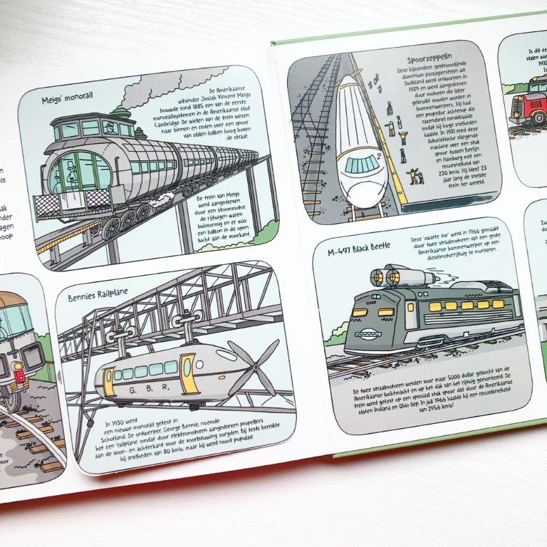 Wij hebben het met veel plezier gelezen en nog wordt het boek er regelmatig bij gepakt. Onze favoriete pagina is helemaal achterin: Gekke treinen. Het belangrijkste misschien wel… Hoe werkt een trein? Krijgt een dikke goedkeuring van opa, die toch echt wel elk boek over dit onderwerp gelezen heeft.