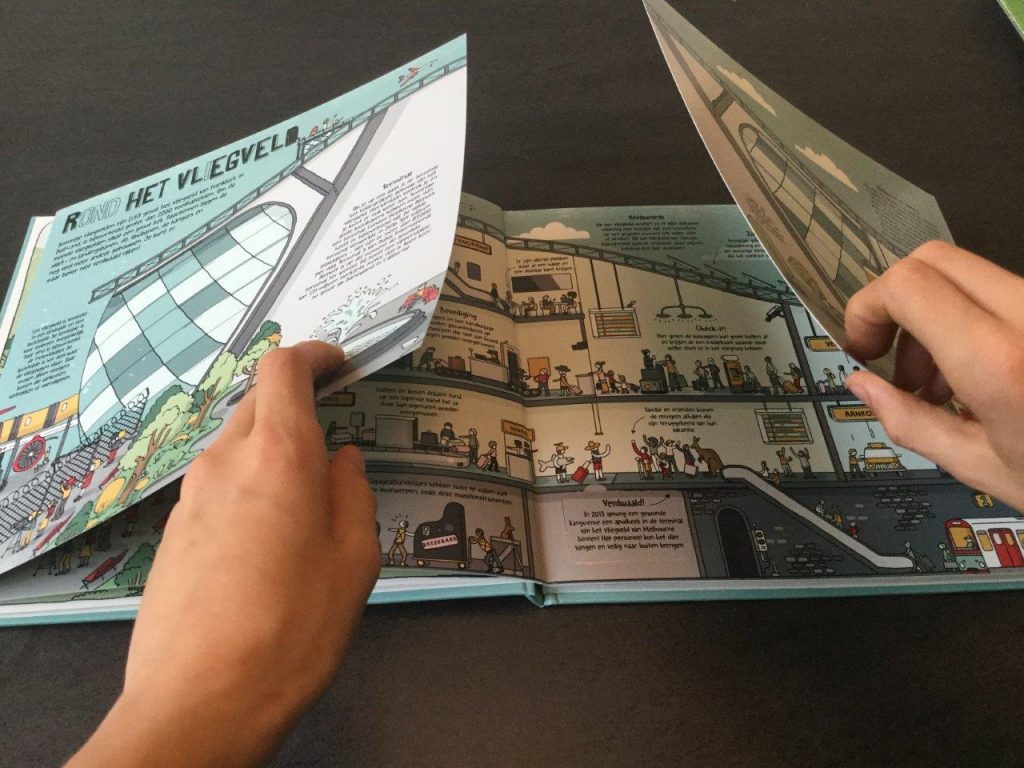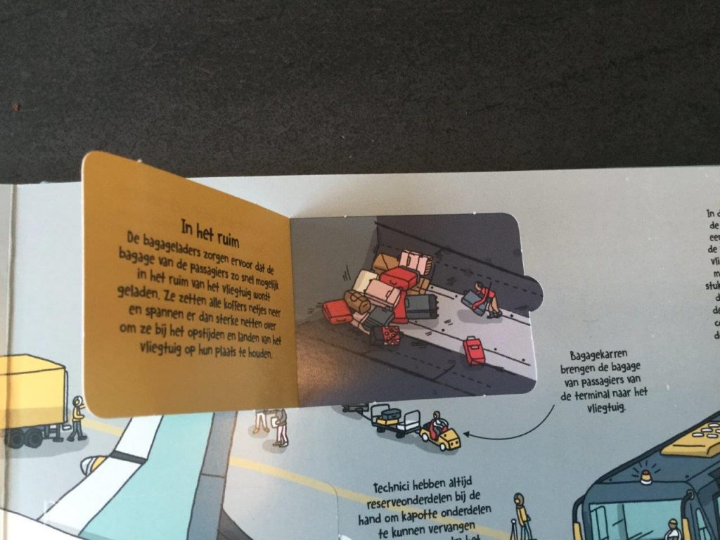 Als je naar de voorkant van het boek, hoe werkt een vliegveld, kijkt denk je vast: “Dit boek is voor kleine kinderen’’. Maar als je erin leest is het een hele encyclopedie! Het zijn simpele maar toch weer mooie tekeningen. Simpel omdat het nogal snel lijkt getekend, en mooi omdat de tekeningen veel laten zien. De verborgen flapjes zijn handig voor extra weetjes. De teksten zijn kort maar krachtig net als de tekeningen. De woorden worden zo goed gebruikt dat het lijkt of je een enorm lange tekst aan het lezen bent. Hoe werkt een vliegveld is handig als je op reis gaat in een vliegtuig met je zoon of dochter van 10 jaar, die nog niet zo veel weten over een vliegveld.