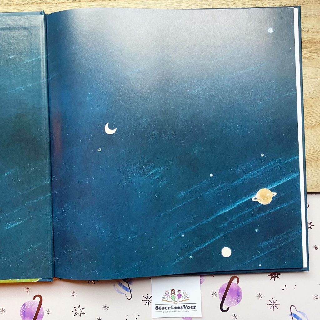 Hoog tijd om eens in het verhaal van Hoe word je vrienden met de maan? te duiken! De schutbladen zijn ook prachtig dromerig geïllustreerd, we gaan echt even op reis in het heelal. De eerste bladzijde is getekend in een warm zonnige kleurenpalet. Wat een vriendelijke en lieve tekeningen zijn dit! Nergens is het eng of donker en daardoor is er alle ruimte om veilig in dit verhaal te duiken. Het boek heeft namelijk een mild filosofisch karakter. Naast de titel worden er ook andere vragen gesteld. Vragen zoals: