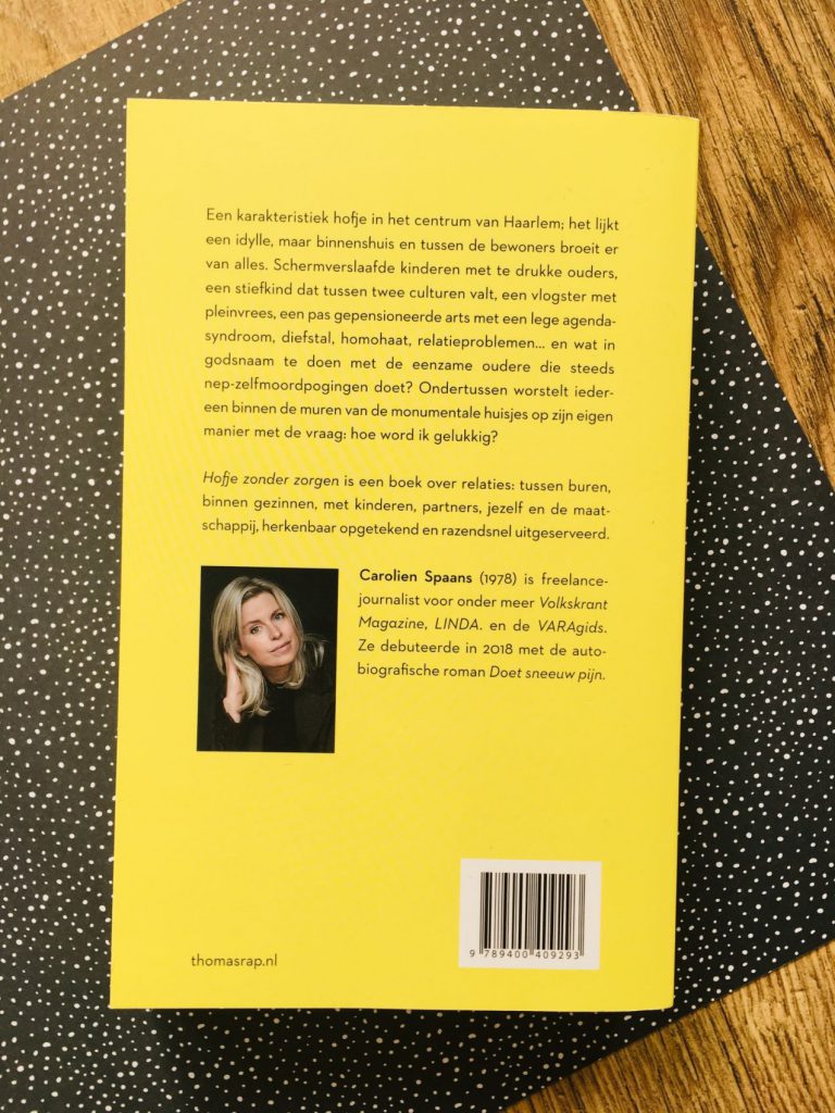 Een karakteristiek hofje in het centrum van Haarlem; het lijkt een idylle, maar binnenshuis en tussen de bewoners broeit er van alles. Schermverslaafde kinderen met te drukke ouders, een stiefkind dat tussen twee culturen valt, een vlogster met pleinvrees, een pas gepensioneerde arts met een empty agenda-syndroom, diefstal, homohaat, relatieproblemen… en wat in godsnaam te doen met de eenzame oudere die steeds nep-zelfmoordpogingen doet? Ondertussen worstelt iedereen binnen de muren van de monumentale huisjes op zijn eigen manier met de vraag: hoe word ik gelukkig? Hofje zonder zorgen is een boek over relaties: tussen buren, binnen gezinnen, met kinderen, partners, jezelf en de maatschappij, herkenbaar opgetekend en razendsnel uitgeserveerd.