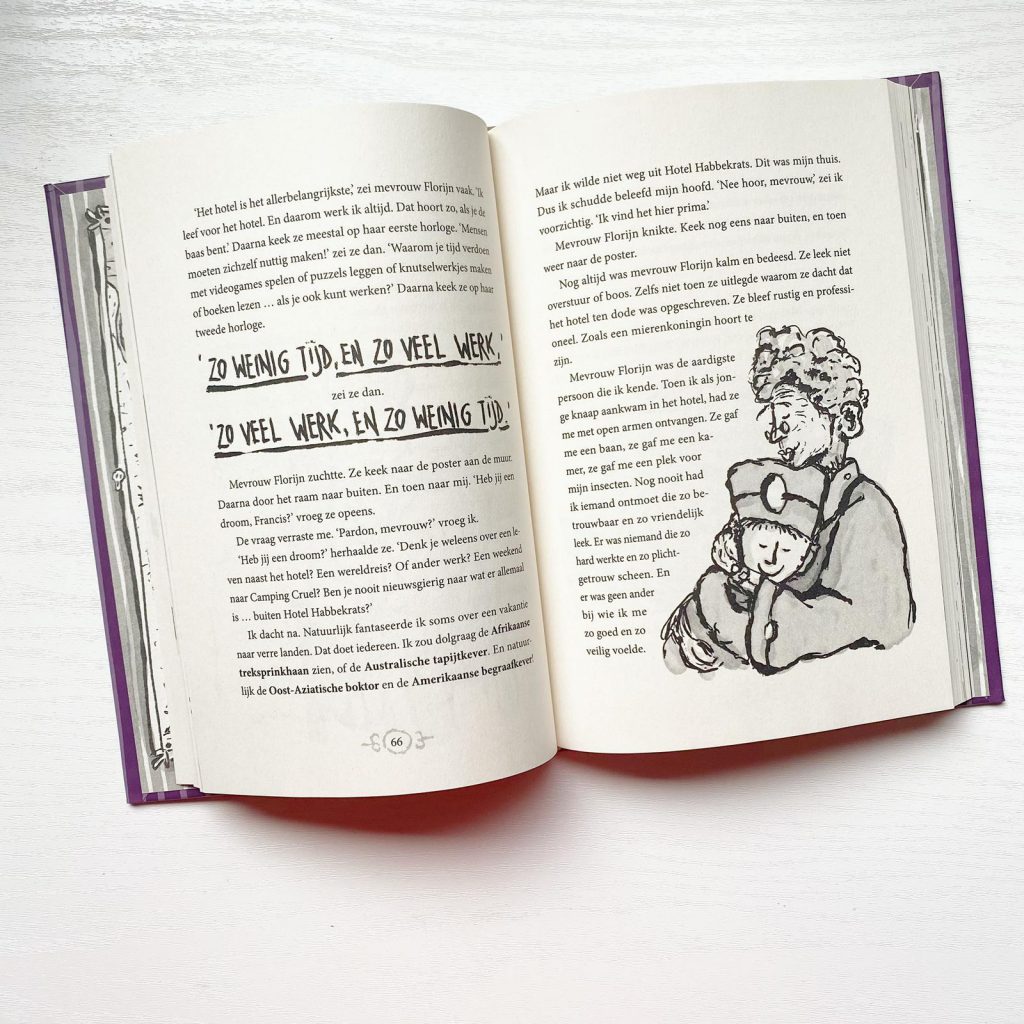 Met veel enthousiasme en liefde treed ik hotel Habbekrats binnen. Eigenlijk was ik nog een beetje aan het twijfelen wat mijn volgende boek zou worden. Maar na de eerste pagina was ik al verkocht en klaar om in te checken. De humor en de gruwels spatten al van de eerste bladzijde. Het is speels zonder kinderachtig te zijn. En bovenal is het een uniek verhaal, dus ik weet op voorhand niet echt waar het mij naar toe gaat brengen. En dat vind ik heerlijk als veellezer en veelkijker van series en films.