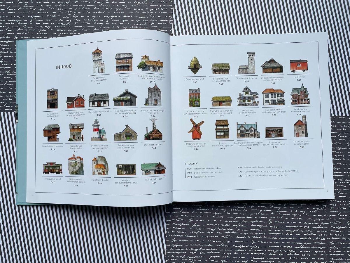 Maar ze zijn allemaal uit zijn fantasie ontsproten. Denk bijvoorbeeld aan een heks, een door poppen gefascineerde dame of een klokkenmaker. Daarbij heeft hij bedacht: in wat voor een huis wonen ze? Hoe ziet zo’n huis eruit en waarom? En waar bewaren deze mensen hun spullen, heeft dit huis nog bijzonderheden en wat is eigenlijk het verhaal van deze inwoner? Doordat dit zo levensecht beschreven is, ga je aan jezelf twijfelen: zou dit nu misschien toch niet een echt bestaand persoon zijn? Hieronder zie je een overzicht van de 30 huizen die je in het boek kunt vinden.