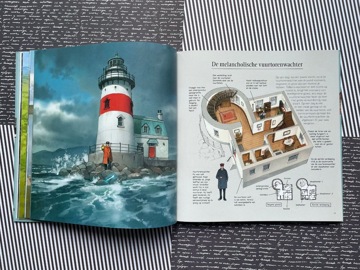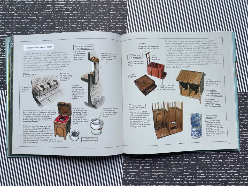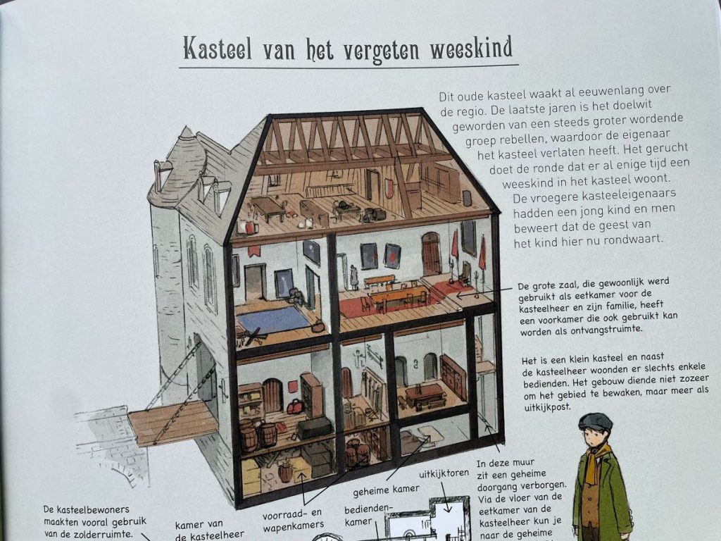 Dit boek is echt een verzameling met van alles en nog wat. De 30 huizen en hun bewoners worden uitgebreid beschreven, maar ook kun je bij elk huis een plattegrond vinden. Dit is super interessant om te bestuderen. Zie je dat de plattegrond overeenkomt met de tekeningen? Dit is heel leuk en leerzaam om met kinderen te bespreken. Verder zijn er nog een paar speciale bladzijdes te vinden in het boek ‘Huizen met een verhaal’. Een uitleg over verschillende soorten daken van huizen, een bladzijde waarin de geschiedenis van het toilet wordt beschreven en een stripverhaal.