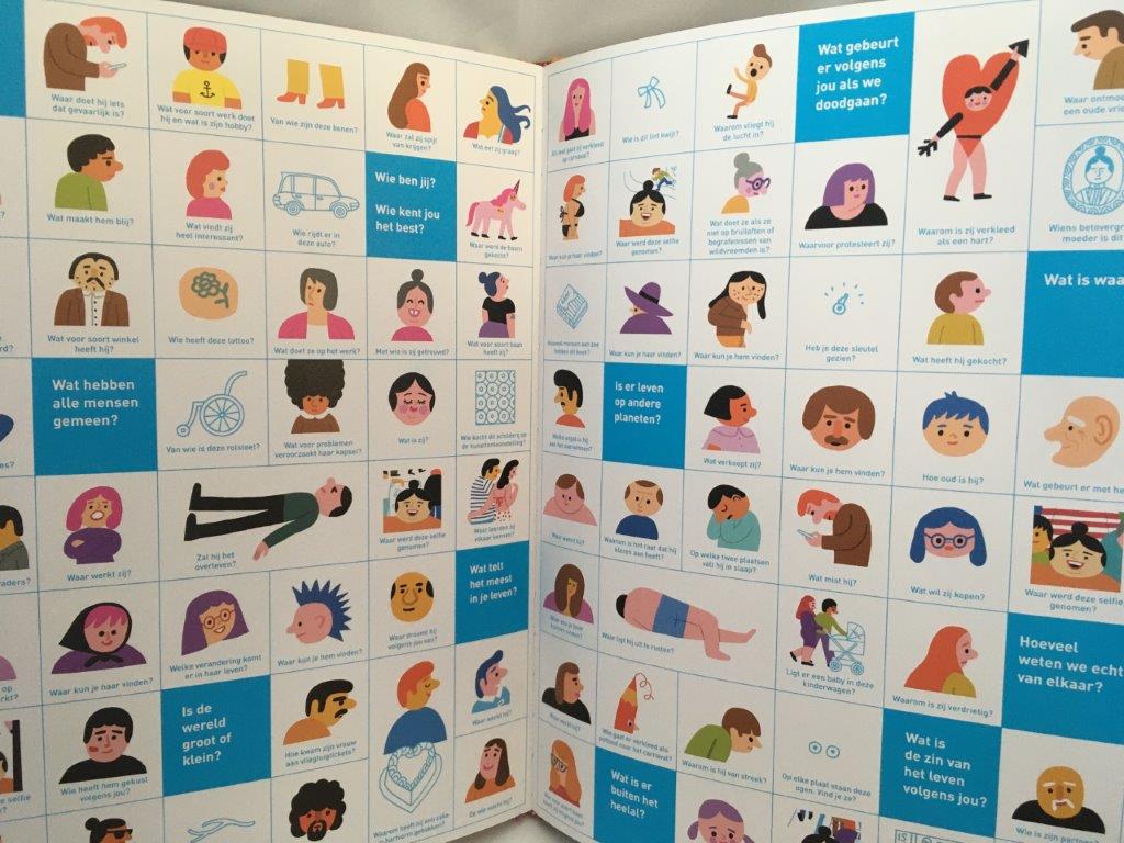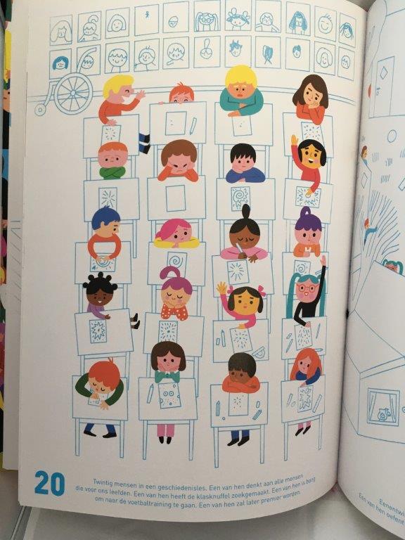 Dat dit boek Iedereen telt mee, niet alleen kleurrijk, maar ook een veelzijdig kijkboek is, wordt snel duidelijk door de zoekopdrachten die achterin het boek staan. Je kind kan lekker door het boek bladeren en de zoekopdrachtjes uitvoeren. Altijd leuk en het houdt je kleuter bezig. Je kind kan de poppetjes tellen die met verzadigde kleuren zijn ingekleurd. De tekeningen stellen iedere keer iets anders voor. Een klas, een park, een feestje, een luchthaven of een huiskamer. In het begin wordt er keurig geteld, maar vanaf 30 worden er sprongen gemaakt die willekeurig lijken. Op zich gaat het dan ook niet over het tellen, maar over hoeveelheden en over meer en minder.