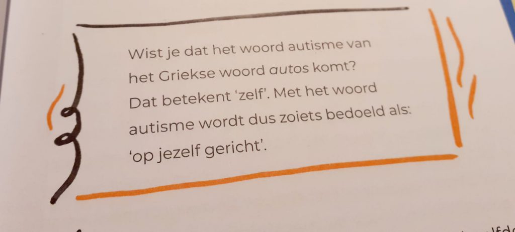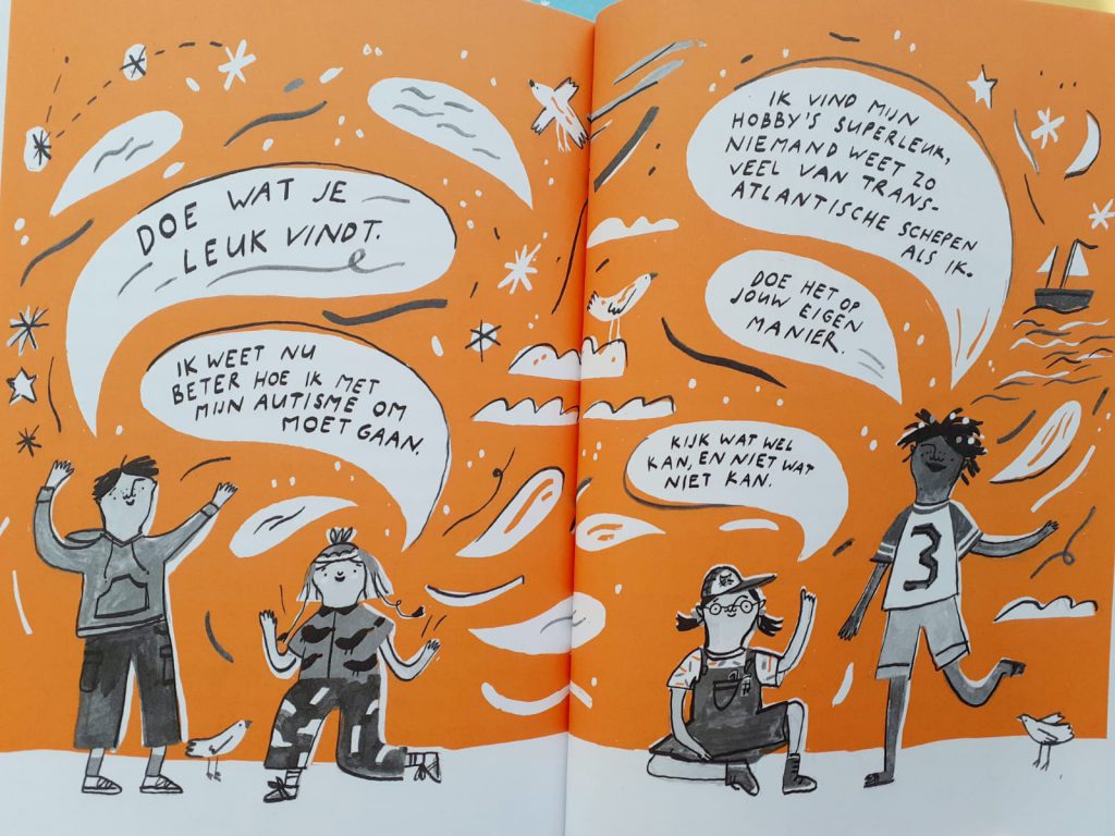 Met de leuke illustraties van Roozeboos en de best wel grappige toon, is het een fijn boek om te lezen. Zo is er een hoofdstuk met de leuke titel ‘over dingetjes in de yoghurt en de heerlijkheid van spekjes’. Want bijvoorbeeld eetproblemen komen best wel vaak voor bij autisme. Zo worden er in het boek meerdere onderwerpen besproken; autisme op school, autisme en je familie, en autisme en sport bijvoorbeeld. Het wordt allemaal beschreven vanuit eigen ervaringen en met eigen woorden. Over wapperen, echoën, sociaal gedoe, stimming, overprikkeld zijn en vervelend oogcontact.