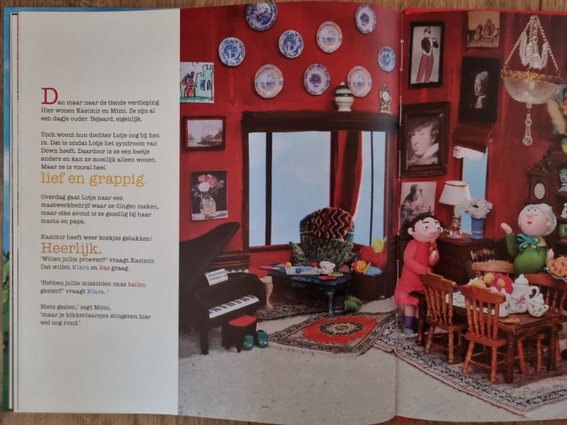 Mijn zoon is echt gek op de Bas & Klara boeken, omdat hij groot ontzag heeft voor de wijze waarop ze zijn gemaakt. De illustraties zijn praatplaten en kunstwerken op zich. Op elke bladzijde is zoveel te zien. Door middel van FIMO klei, stokjes, stof, papier, wol, ijslollystokjes en nog zoveel meer materialen zijn er scenes gemaakt waar het verhaal zich afspeelt. Mijn zoon pakte direct het andere Bas & Klara boek erbij, waaruit blijkt dat de figuurtjes herkenbaar zijn in beide boeken. We kwamen er toen ook achter dat Bas & Klara in de gewoontoren eigenlijk het eerste boek is, maar ze zijn absoluut los van elkaar te lezen.