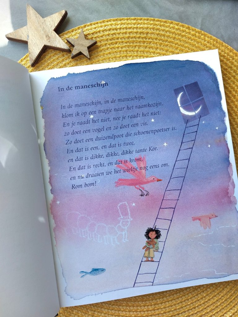 Als je dan een leuk voorleesboek zoekt, dan is In de Maneschijn een prachtige aanrader. De kunsten en fantasie van heel veel bekende schrijvers en illustratoren zijn gebundeld. Om kinderen mee op reis te nemen en de dag af te sluiten met een versje, liedje, verhaal of gedicht.