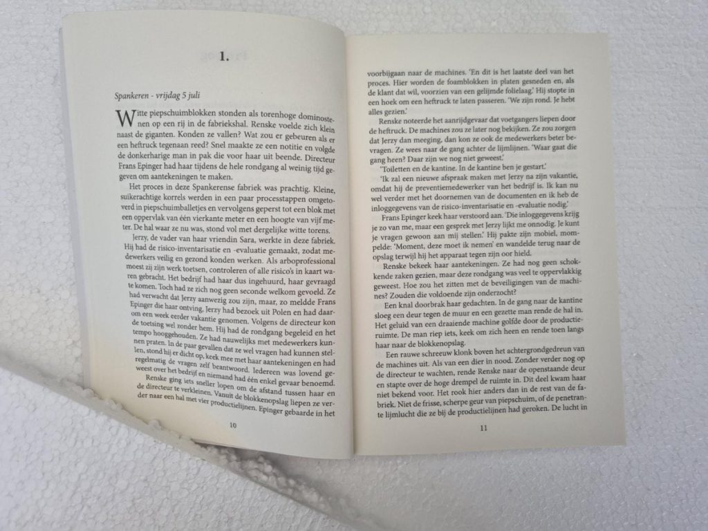 In Isolatie spelen er twee verhaallijnen die in eerste instantie ver uit elkaar lijken te liggen. Wel is de context, de piepschuimfabriek, gelijk. Dit doet vanzelfsprekend vermoeden dat de verhaallijnen ergens bij elkaar gaan komen. Dit is natuurlijk het geval. Toch heb ik geen moment kunnen voorspellen hoe dit verhaal zou aflopen. Niet alleen de ‘dader’ kon ik niet aanwijzen, maar ook de afloop voor alle personages was moeilijk te voorspellen. Dit vind ik heerlijk.