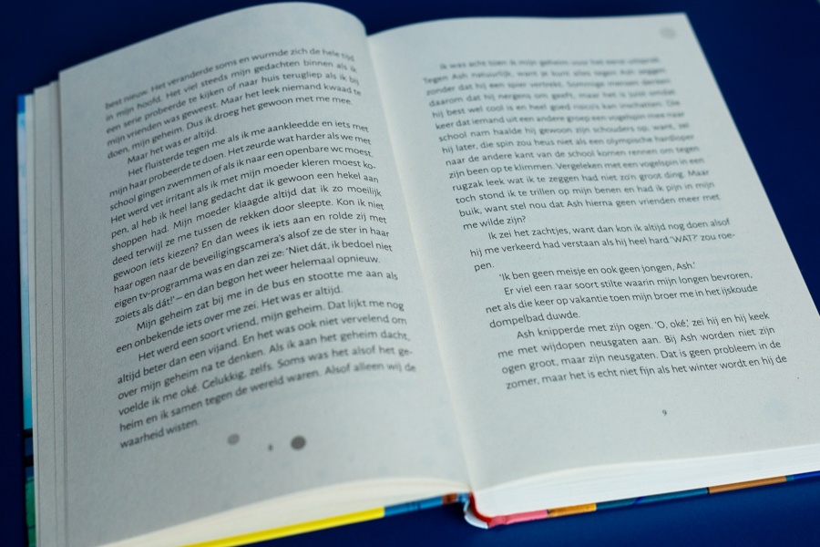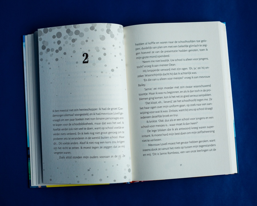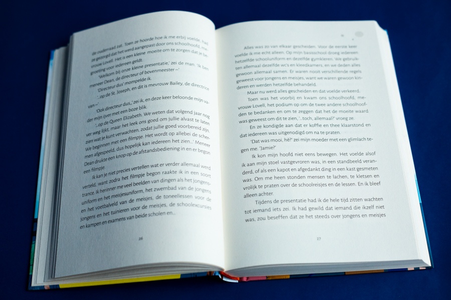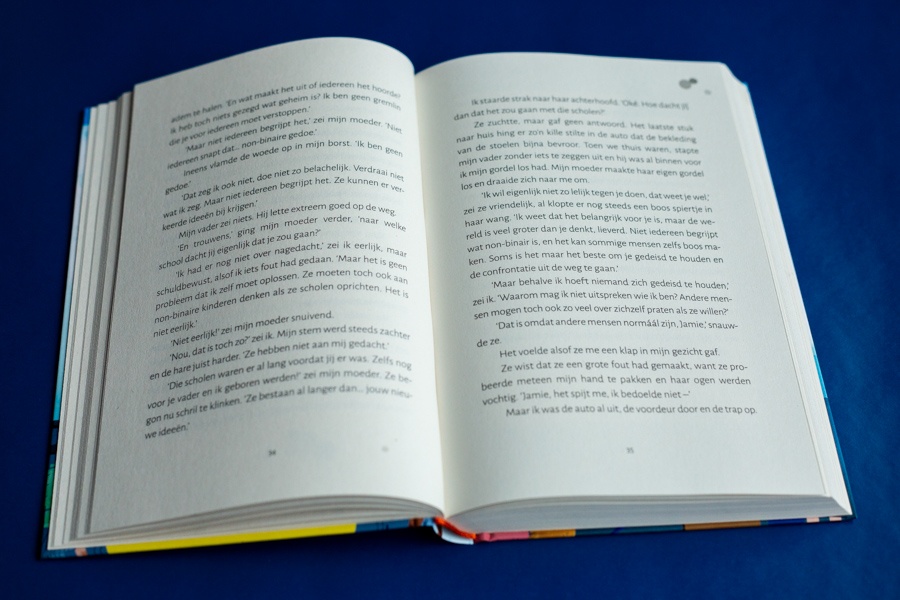 Wat als je non-binair bent en zoals Jamie moet kiezen tussen een jongens- of meisjesschool? Voor zover ik weet zijn dat soort gescheiden middelbare scholen er niet meer in Nederland. Wel hebben we op heel veel openbare plekken gescheiden toiletten. Of wat denk je van de kledingwinkels met aparte jongens- en meisjesafdelingen. Door het lezen van Jamie tegen de wereld kijk ik heel anders naar de opties voor non-binaire personen. Zo hoef je in ieder geval in de trein niet te kiezen tussen een dames of heren toilet 😉
