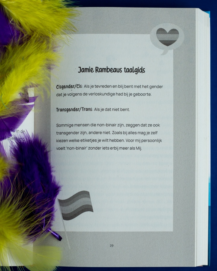 De handige taalgids van Jamie, door het boek heen, geeft je net dat extra achtergrondinformatie. Stof tot nadenken ook. Wist jij dat er naast de bekende Pride op 25 juli er ook de dag van non-binaire mensen is op 14 juli? En dat de Pride is ontstaan nadat de homokroeg The Stonewall (New York) met harde hand werd ontruimd. Hierop volgde in Londen de eerste Pride parade in 1972 waarna het evenement de naam LGBT+ Pride kreeg. Inmiddels zijn er Pride parades over de hele wereld. De Pride parade is zowel een viering als een demonstratie voor mensen die LHBTQ+ zijn.