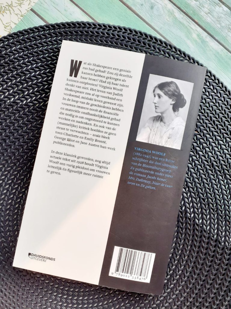 We lezen over de grote behoefte aan filosoferen en kennis vergaren van deze interessante vrouw. In dit pleidooi gaat ze in op de filosofische vraag ‘Wat als Shakespeare een net zo begaafde zus had gehad‘. Had zij zich ook zo kunnen ontplooien tot een befaamde schrijver? Zeer waarschijnlijk niet, zo is de conclusie. Want het werd niet van haar verwacht. Erger nog, het werd eerder ontmoedigd voor vrouwen om te schrijven. Vrouwen werden langere tijd gezien als ondergeschikt. En zo zijn mogelijke genieën en talenten lange tijd onopgemerkt gebleven. Tot boosheid en verdriet van Virginia Woolf.