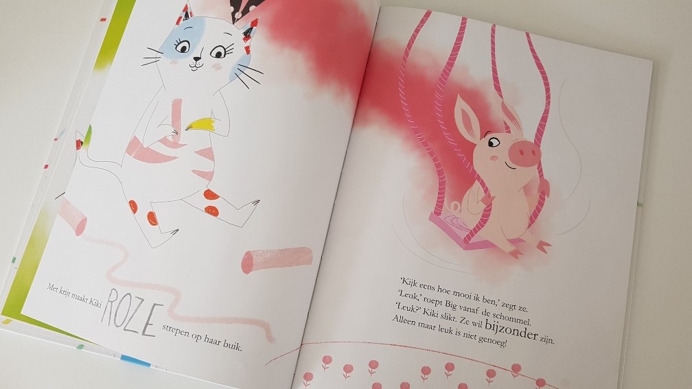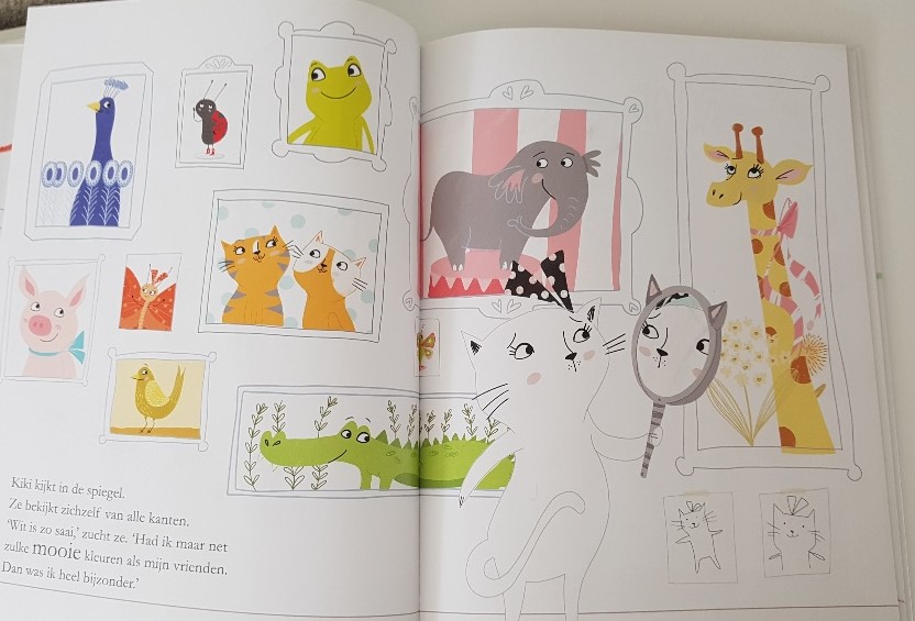 In het echt is Kiki een prachtige witte kat in jij bent bijzonder. Ze vindt haar vrienden heel bijzonder want die hebben allemaal prachtige kleuren. Ze zegt eigenlijk tegenzichzelf: jij bent bijzonder als je maar wat meer kleuren had.