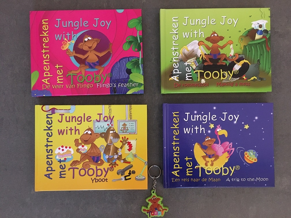 Deze serie boeken bestaat uit 6 delen. Het eerste boek uit de serie is ‘De veer van Flingo’ of in het Engels ‘Flingo’s Feather’. Tooby is in de jungle op zoek naar lekkere bananen, maar dan ziet hij een flamingo. Wat heeft die mooie veren! Daar zou Tooby ook wel een veer van willen. Stiekem probeert hij een veer van de flamingo te pakken, maar dat loopt niet helemaal goed af….