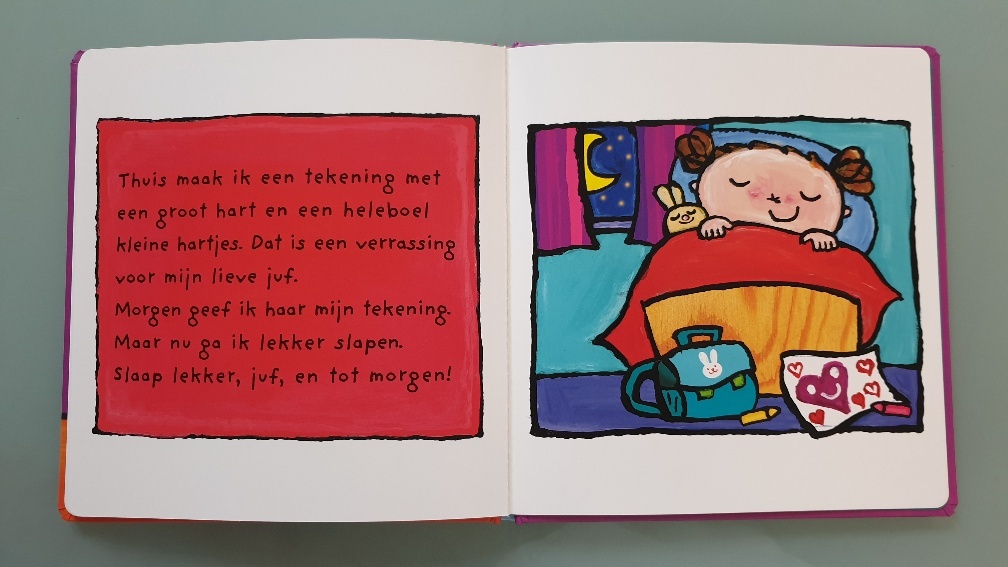Kaatje en de juf is een lief prentenboek van Liesbet Slegers. Dat begint met een super lief gedicht. Een knuffel hier, een knuffel daar, hé lieve juf het is echt waar. ik vind je zo ontzettend lief, ik ben jouw hartendief!