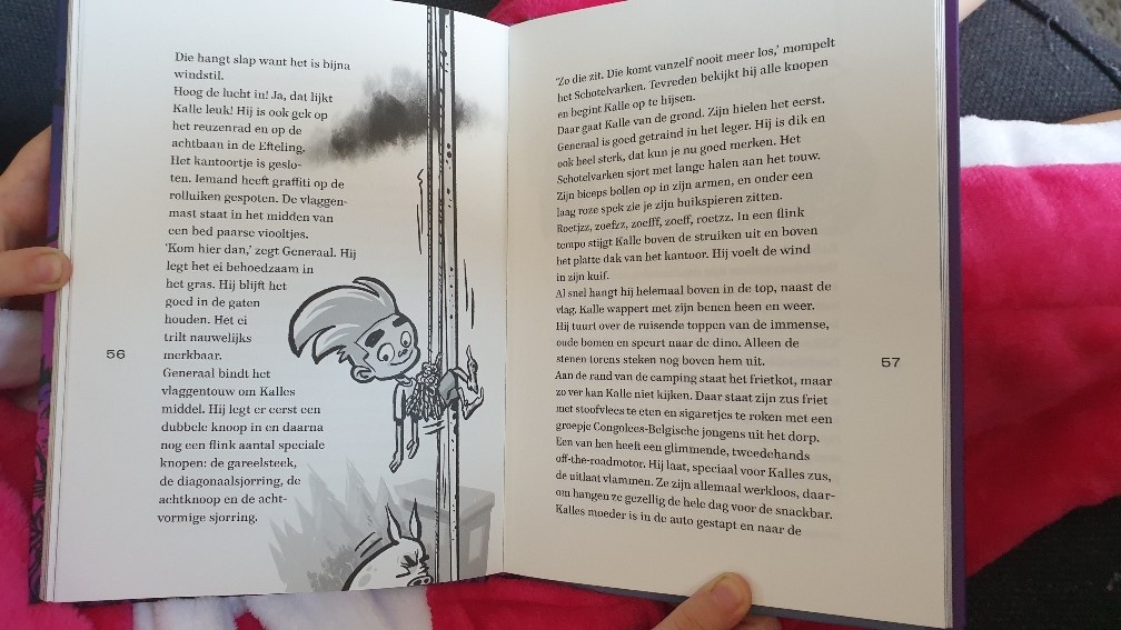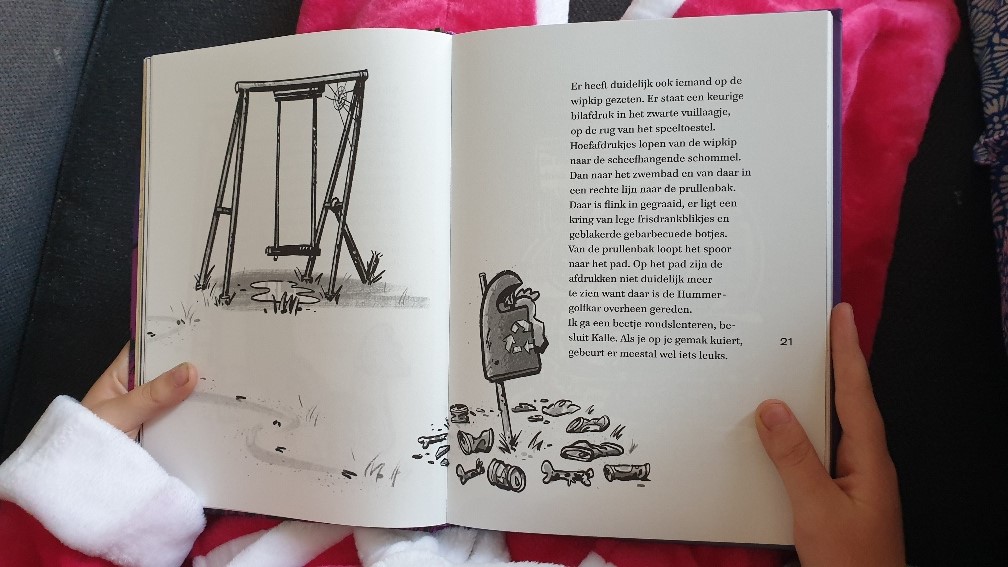 De illustraties die in Kalle en het Dino ei staan zijn echt geweldig! Ze spreken goed voor de verbeelding, net zoals de schrijfstijl van de schrijfster trouwens. Ik heb nog nooit zo’n levende beschrijving gehoord van de billen van een varken hahaha Voor kinderen is het ook heel herkenbaar dat je allerlei soorten winkels herkend die worden genoemd.