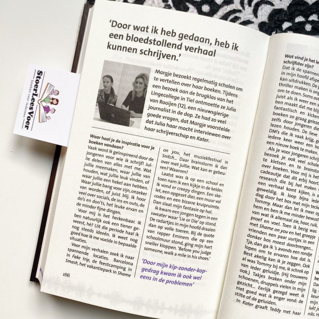 Wat ze ook zo goed doet, is het opzoeken van haar doelgroep. Ik zie haar vele schoolbezoeken afleggen en echt de jongeren bereiken. Vervolgens lees ik reacties op onze boekenblog dat ze haar bezoeken zo tof vonden en meteen wilden gaan lezen. Dan heb je als volwassenen toch eigenlijk niks te vinden over een boek? Als een lastige leesgroep met zoveel plezier een boek oppakt. Verhalen die spannend zijn maar ook belangrijke maatschappelijke thema’s verweven hebben. Dan verdien je alle lof wat mij betreft.