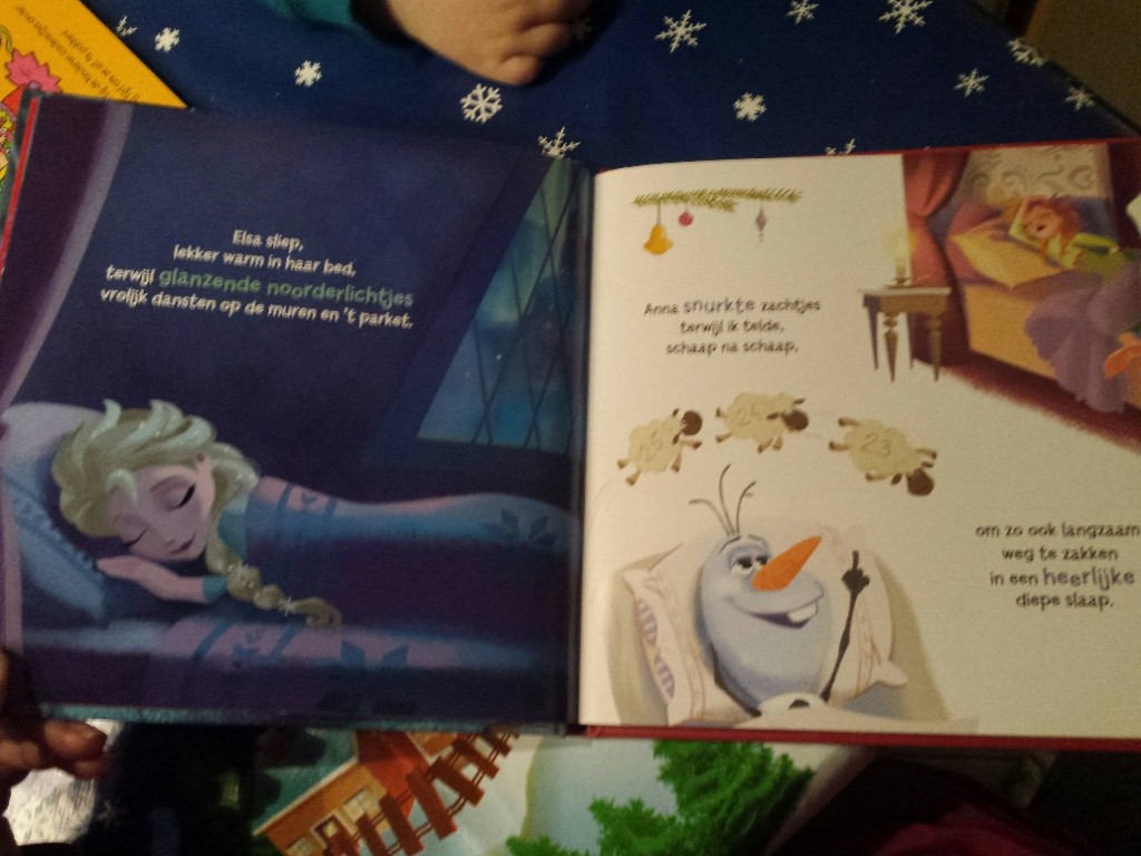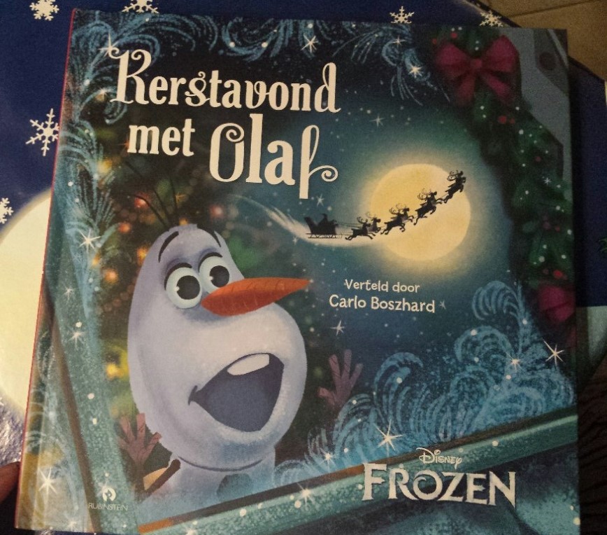 De tweede foto heb ik wel 4 keer opnieuw moeten maken omdat steeds dochterlief haar handje er voor zat omdat ze het kerst prentenboek met grote vriend Olaf weer terug wilde om te lezen. Nadat ik zelf 3 keer de film Frozen voor haar had opgezet heeft ze er nadien nog zelf 4 keer om gevraagd. Ook weet ze prima dat mama op haar telefoon op YouTube de korte filmmuziekjes kan afspelen en dan zingt ze graag mee. Dus toen ik dit boek zag liggen in de winkel twijfelde ik geen moment en nam hem direct mee. Het leuke is dat er bij dit boek een cd bij zit waarop Carlo Boszhard ( de stem van Olaf de sneeuwpop in de film Frozen) te horen is die dit leuke verhaal voorleest.