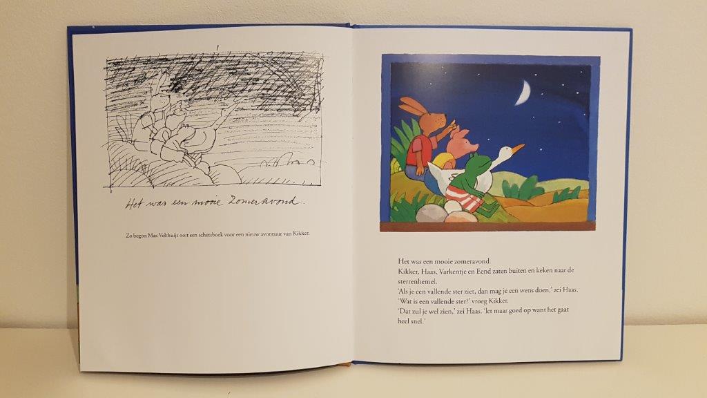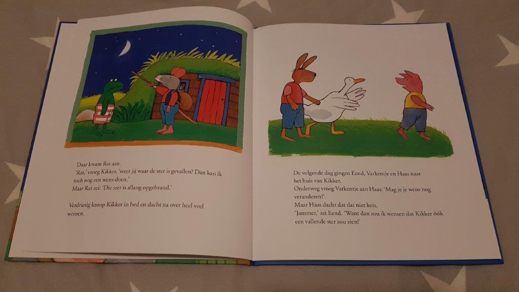 Enthousiast riep Varkentje dat ze nu een wens mochten doen. Kikker was teleurgesteld, omdat hij als enige geen wens mocht doen. Met een traan op zijn wang loopt hij naar huis. En af en toe keek hij hoopvol omhoog. Hij kwam Rat tegen en Kikker vroeg aan hem waar hij de vallende ster weer kan vinden. Maar Rat zei dat die allang opgebrand is.