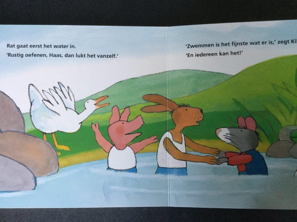 Kikker gaat zwemmen heeft een harde kartonnen kaft voor de wat jongere kinderen. En ook al is dit een boekje voor de doelgroep tot 4 jaar, mijn dochter van 6 blijft Kikker leuk vinden. Dat ze nog aan het leren zwemmen is en dit boekje daarover gaat helpt ook natuurlijk. De boekjes en verhalen stralen eenvoud uit. De figuren zijn zoals beesten eruit zien, maar wel op een manier die benaderbaar is. Het zit tussen strip en werkelijkheid in.