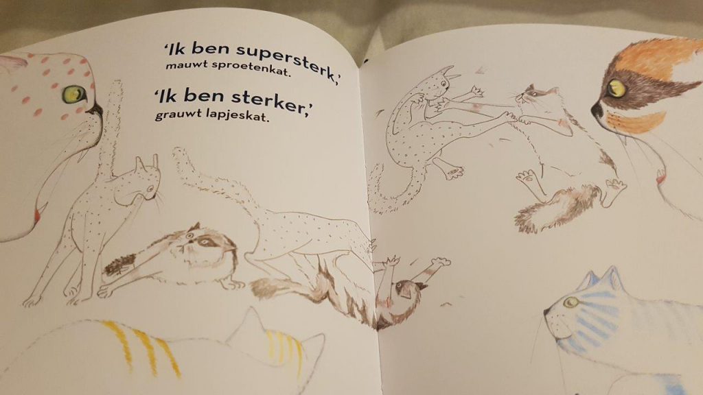 Aan de mooie tekeningen kun je echt aflezen wat poezen lijken te denken. Marijke Rondelez geeft in haar kinderboeken over poezen (ze heeft er meerdere op haar naam: eerder verschenen ‘Ssst… Poes slaapt’ en ‘Poes waar ben je?’) goed weer welke houdingen van de poes bij welk gedrag horen. Bijvoorbeeld dat je aan de dikke staart en de hoge rug bij het betasten van een eng, prikkelig balletje al ziet dat de poes schrikt van het egeltje. Mooie details voor voorlezende poezenmoeders!