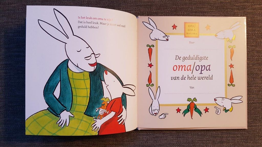 Beide bovenstaande kinderboeken voor opa en oma sluiten hun verhaal af met een diploma. Morgen krijgt mijn moeder die van haar. Ze is dan jarig en samen met mijn zoontje heb ik dit boek voor haar ingepakt. Oh ja, ze krijgt er ook een paraplu bij, haha. En opa? Die moet nog even geduld hebben, het is bijna vaderdag en dan krijgt hij het van mij.
