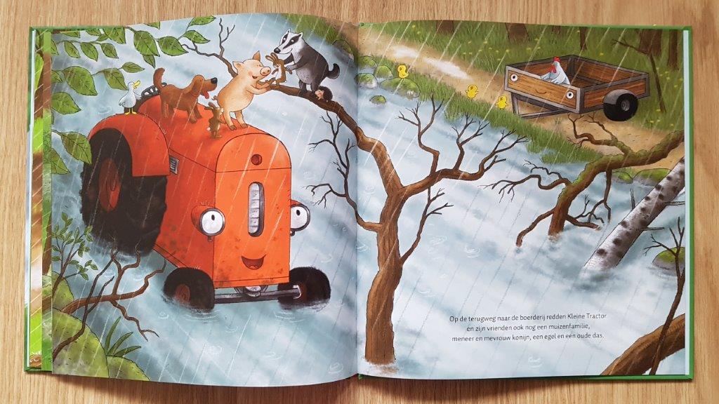 Laura de eend helpt Kleine Tractor de weg te vinden door de rivier. Gelukkig houdt Kleine Tractor het vol zonder bang te worden en hij weet Annette de kip en haar kuikens op het droge te krijgen. Zijn dierenvrienden zorgen ervoor dat de kip en kuikens worden opgewarmd. En op de weg terug naar de boerderij redden ze met zijn allen zelfs ook nog meer dieren in nood! En Papa Tractor? Die is natuurlijk – net als alle dierenvrienden – supertrots op de stralende Kleine Tractor.