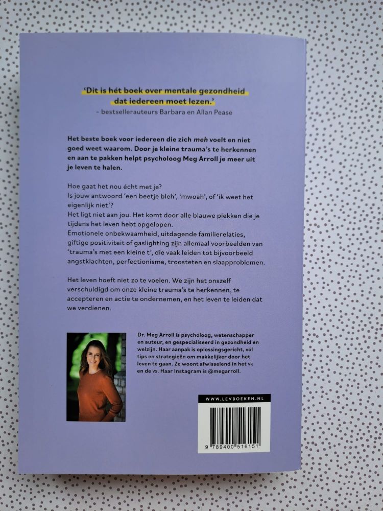 Kleine trauma’s is een boek waarbij de titel precies de lading dekt: het gaat over kleinere gebeurtenissen die (vaak onbewust) toch veel impact hebben op je leven. Het gaat om het gevoel dat je niet precies weet wat er mis is, maar het toch niet goed voelt. Echt iets anders dan grote trauma’s, waarbij het heel duidelijk en logisch is dat je je niet goed voelt, bijvoorbeeld na het overlijden van een dierbare of een scheiding enz. In Kleine trauma’s laat psycholoog Meg Arroll zien hoe je er achter komt dat deze gebeurtenissen je in de weg zitten en hoe je daar een andere weg in kunt vinden. Interessant leesvoer!