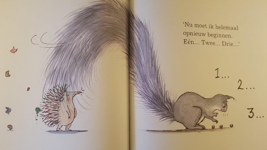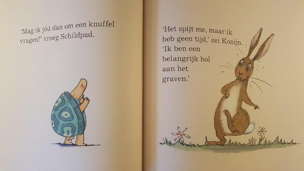 Zowel Egel als Schildpad zoeken naar iemand die ze allebei weer blij wil maken door een knuffel geven. Beide vragen ze, los van elkaar, Egel via de ene kant en Schildpad via de andere kant van het boek, alle dieren die ze tegenkomen om hen te knuffelen, maar niemand wil. Ik schrok er zelf van hoe hard dit in het boek werd gezegd, vooral door Eekhoorn die “te druk was met zijn 3 nootjes te tellen” en dat met het plaatje erbij waarop hij zich omdraait met zijn staart in Egels verdrietige gezicht. Je zou hem spontaan een knuffel willen geven!