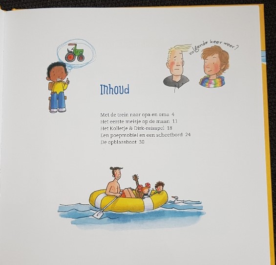 In Kolletje en Dirk samen op reis staan 4 verhalen met verschillende voertuigen in de hoofdrol. Zo is er het avontuur met de trein naar opa en oma. Het avontuur met de kartonnen raket naar de maan. Een verhaal met een poepmobiel en een scheetbord. ( haha goed verzonnen) en er is iets met een opblaasboot aan de hand.