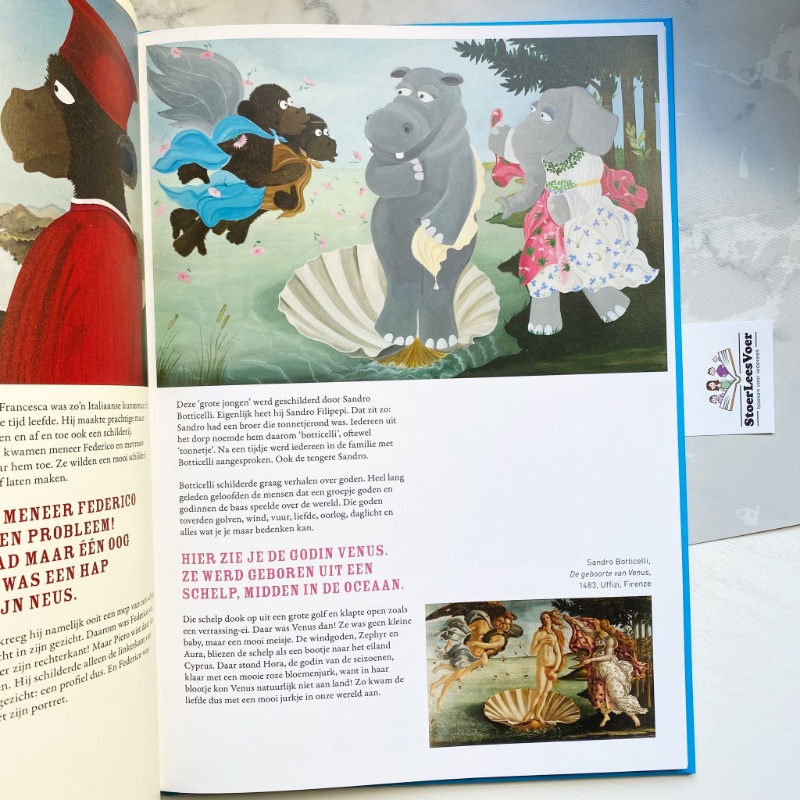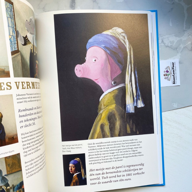 Kunstknallers is een best-of-editie van de boekenreeks Grote kunst voor kleine kenners. Thaïs Vanderheyden heeft namelijk bekende kunstwerken omgetoverd tot haar interpretatie, vol pluizige en toffe dieren. Voor mij als volwassene was het echt even wennen. Eerst dacht ik dus dat het een beeldrechten-dingetje was; dat gebeurt vaker in kunstboeken. Maar tot mijn verrassing staan er ook afbeeldingen van het originele kunstwerk bij! Langzaam begin ik te snappen wat Thaïs Vanderheyden hier voor iets unieks gedaan heeft. Het is écht een boek voor jonge kenners. Want zodra mijn dochter van 8 dit boek in haar vizier heeft, smult ze van alle dieren in de kunstwerken.