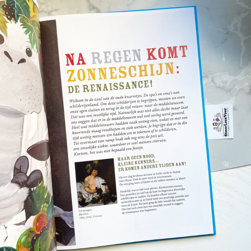 Zoals gezegd moest ik als volwassene even wennen aan de illustraties in Kunstknallers, maar ik ben om. Het is een toffe manier om kinderen naar kunst te laten kijken, om herkenningspunten en stijlen te herkennen. Om ze uit te nodigen. En het werkt gewoon voor kinderen. Vanderheyden brengt kunst echt naar de kinderen toe. Die kijken nou eenmaal graag naar lieve dieren met sprekende kleuren. Het ‘Zotte snoeten en gekken bekken: portretten’-hoofdstuk kan rekenen op veel gelach van mijn dochter. Door die titel kijkt ze direct anders naar portretten. Hoe kijkt iemand en inderdaad, wat is het soms een gekke bek. Daarnaast ben ik wel blij dat de originele kunstwerken wel toegevoegd zijn, want ook daarvan vind ik het belangrijk dat kinderen deze zien.