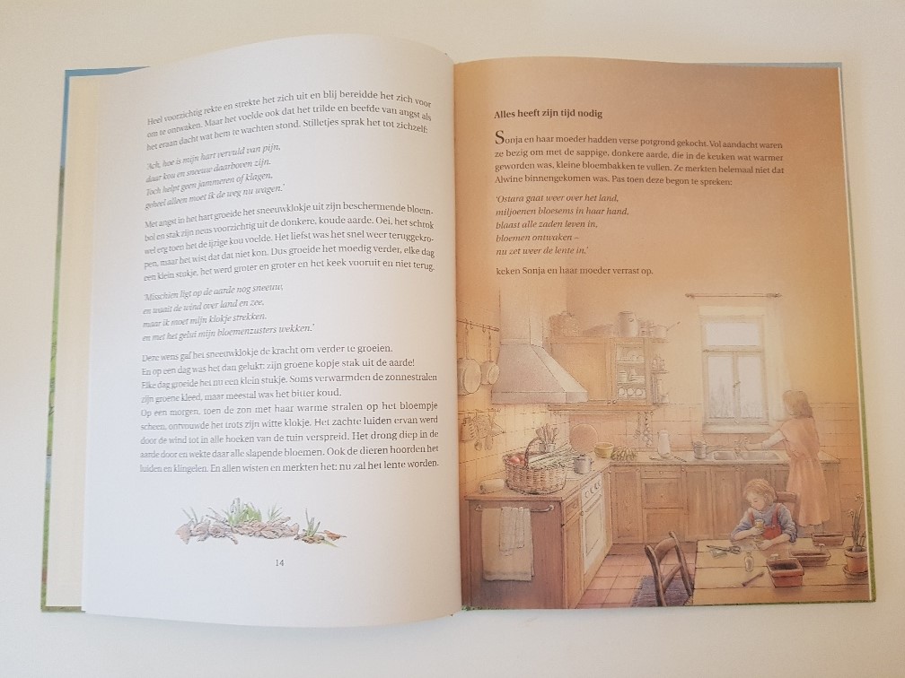 Lentefeest staat vol met prachtige illustraties. De kaft alleen al, van veraf lijkt het of er allemaal schapen in de wei lopen. Maar van dichtbij zie je duidelijk de bloesem in bomen staan.