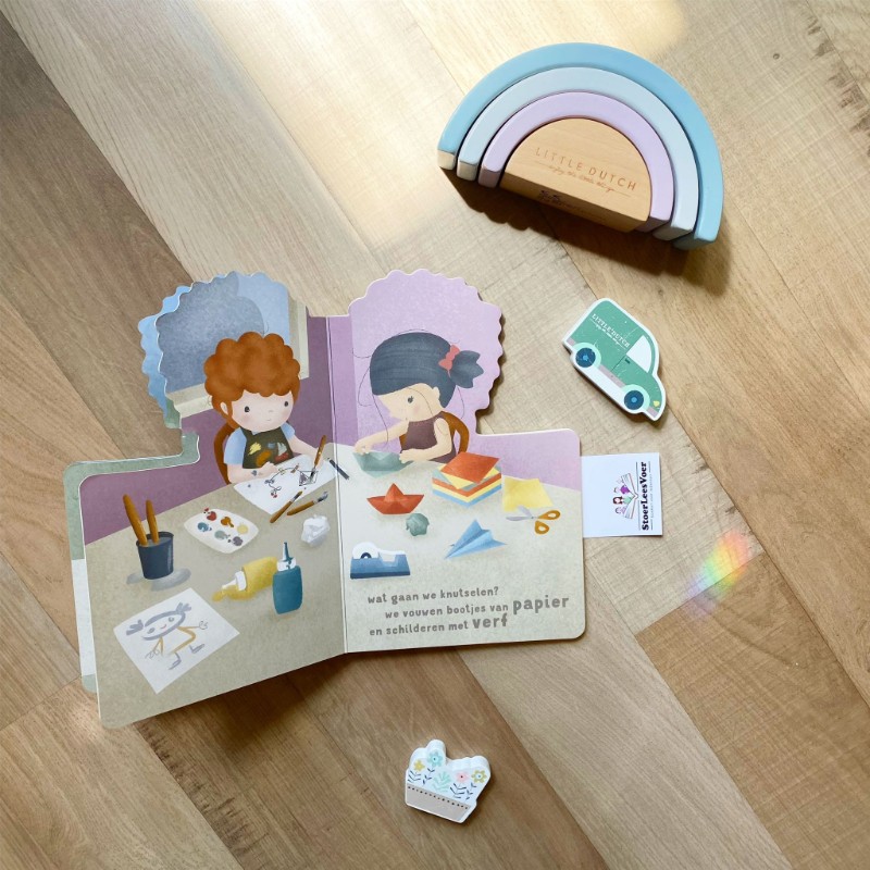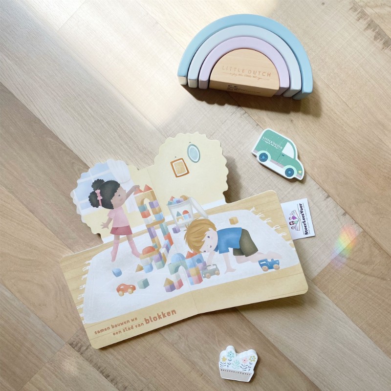 Maar we hebben twee Little Dutch boeken gekregen! Kom je spelen? is het tweede prentenboekje dat we lekker samen gaan lezen. Dit is meer een voorleesboekje. De prenten zijn net zo lief en herkenbaar. In dezelfde fijne, zachte kleuren. In dit boekje zie je diverse soorten kinderen die lekker samen spelen op diverse plekken, met diverse spullen. Dat brengt me meteen bij het hoofdthema: samen spelen en diversiteit/inclusiviteit. Heel mooi en eenvoudig in beeld gebracht. Jongens en meisjes in diverse kleuren beleven de leukste avonturen. Knutselen, steppen, verkleden of met blokken bouwen: kinderen houden van spelen en doen dat graag samen met hun vriendjes. De inhoud van het boek gaat over spelen, maar door de bijzondere vorm is het boek zelf ook leuk om mee te spelen!