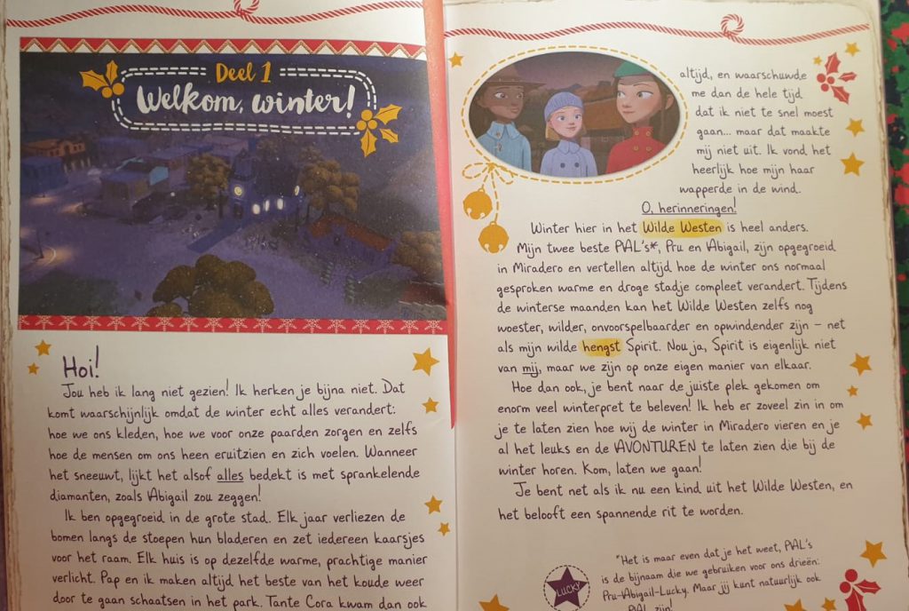 In Lucky’s boek vol winterpret maken we eerst kennis met Lucky Prescott. De bereidster van Spirit het wilde paard. Ze woont in het Wilde Westen in het stadje Miradero, en laat je kennis maken met alle winterse tradities. Haar vriendinnen Pru en Abigail hebben natuurlijk geholpen om voor de lezer de leukste knutsels, quizzen, spelletjes te bedenken.