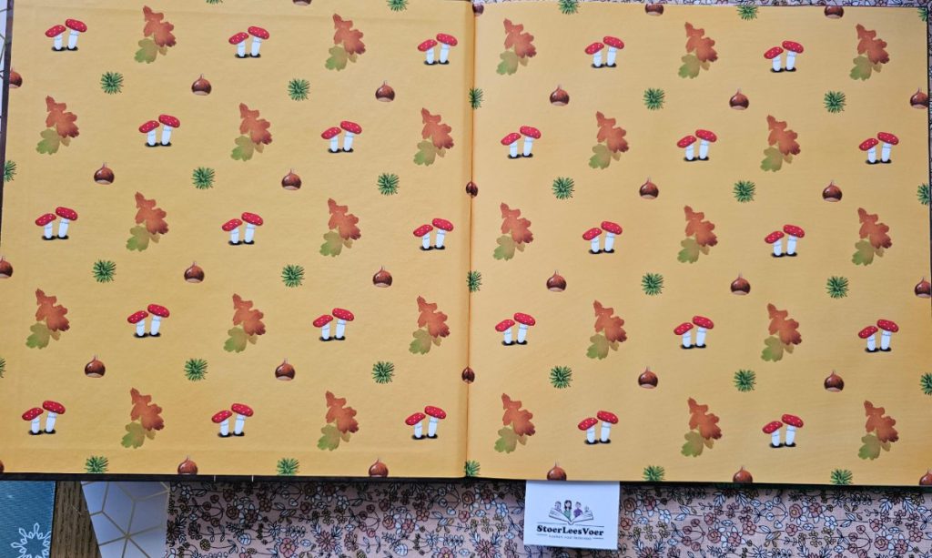 En dan de binnenkant. Een oranje veld vol kastanjes, bolsters en paddenstoelen rood met witte stippen en prachtige herfstbladeren kijken me tegemoet. Eens even kijken wie er synchroon kan tellen!